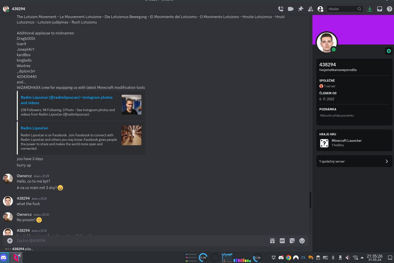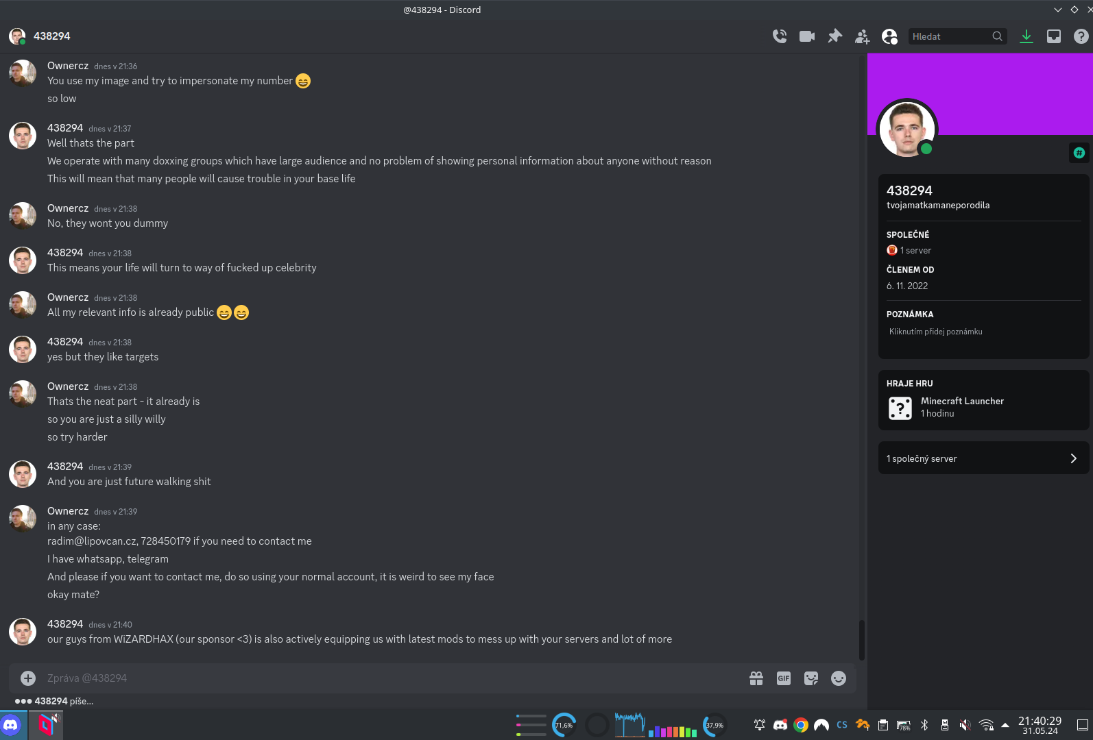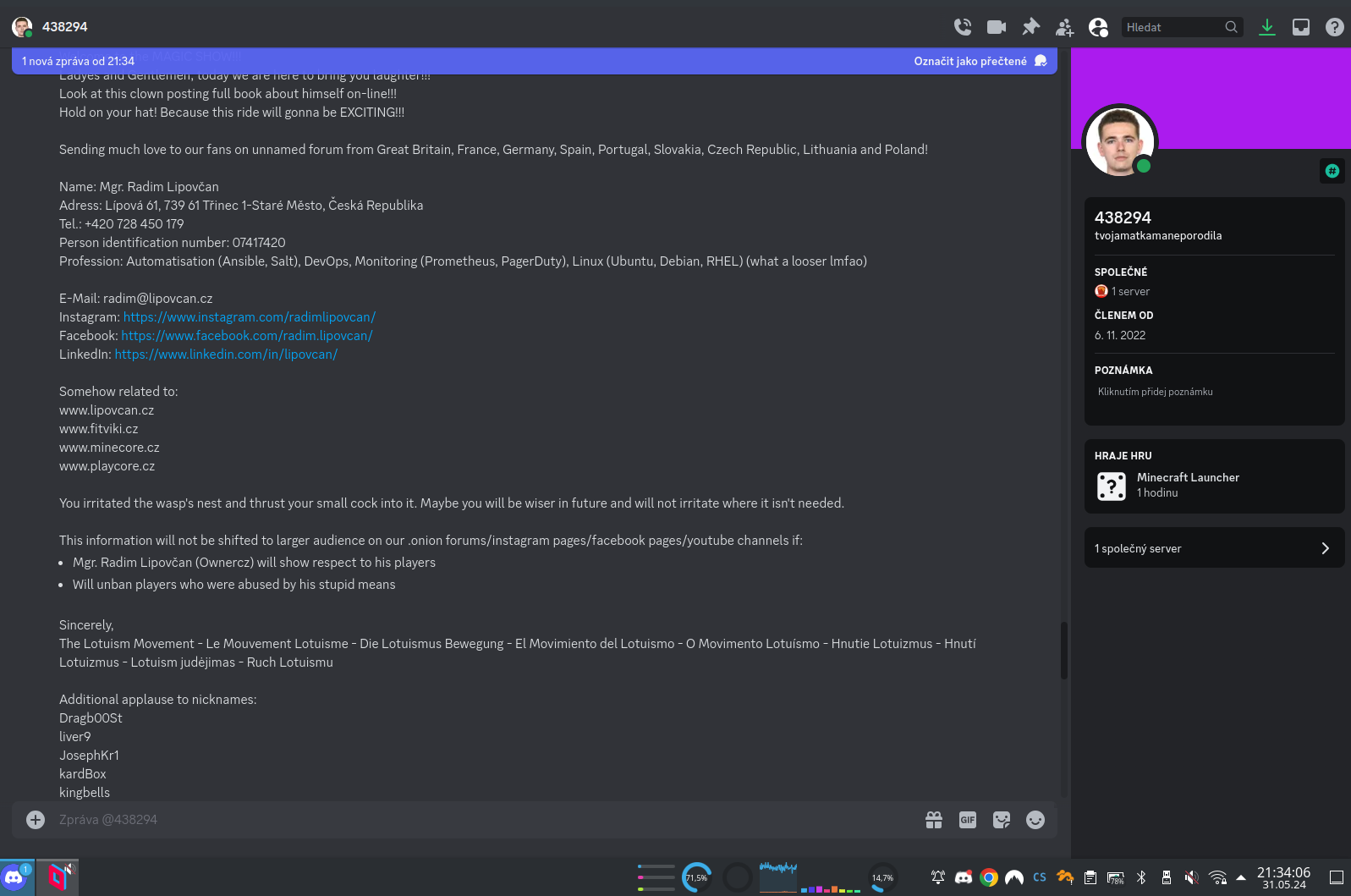 Docela zajímavá je tato část, kdy jsem údajně naštval vosy a … kickem a banem? No okay, Karen z Minecraftu, toto je overreaction velikosti Sněžky. Dokonce tady máme i kroky, které musím udělat, aby tyto informace nešly dál ven! Oh no, anyway… Karen started blasting – technická vstuvka – borec si změnil nick z psychedcorpse na 438294 a hodil si na DC mou profilovku, kterou mám na Linkedinu. V galerii vidíte, jak probíhaly soukromé zprávy v chatu: