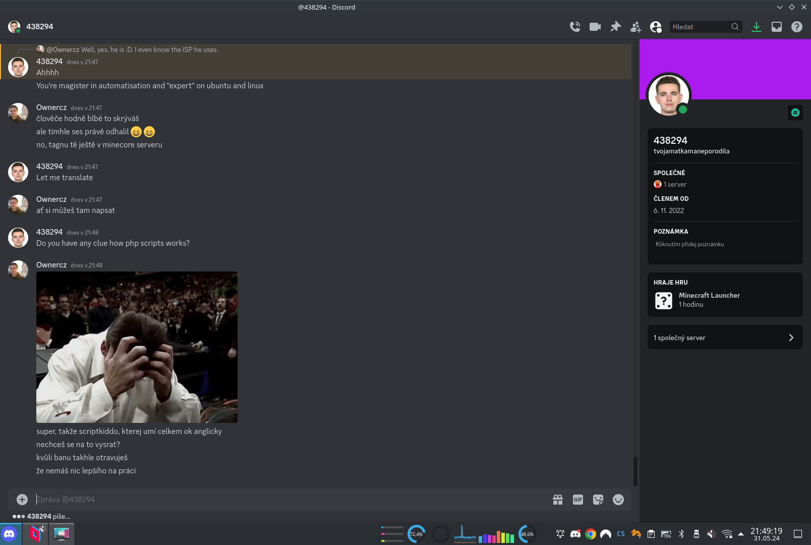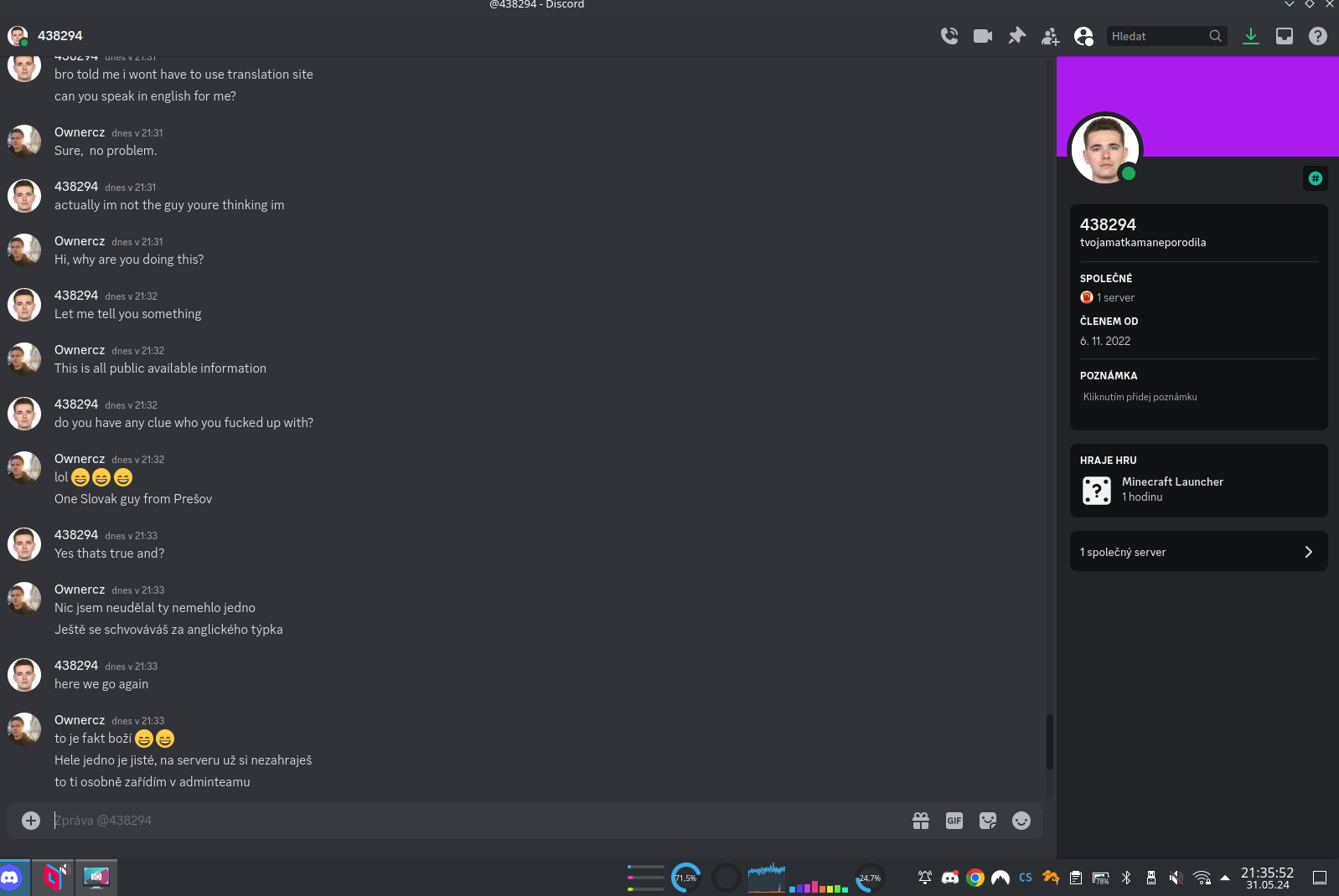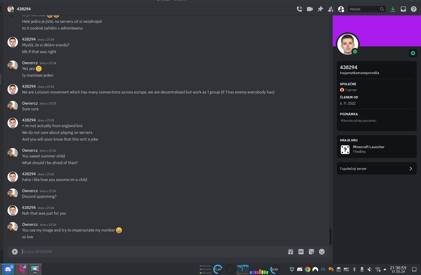 Docela zajímavá je tato část, kdy jsem údajně naštval vosy a … kickem a banem? No okay, Karen z Minecraftu, toto je overreaction velikosti Sněžky. Dokonce tady máme i kroky, které musím udělat, aby tyto informace nešly dál ven! Oh no, anyway… Karen started blasting – technická vstuvka – borec si změnil nick z psychedcorpse na 438294 a hodil si na DC mou profilovku, kterou mám na Linkedinu. V galerii vidíte, jak probíhaly soukromé zprávy v chatu: