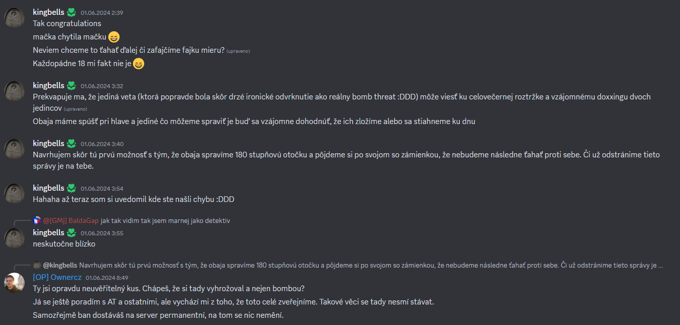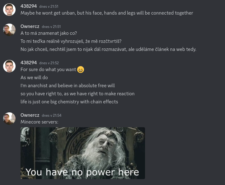 A zde už vidíme moment, kdy se vše zvrhlo, za 13 let provozu Minecore se nám ještě nestalo, že by někdo reálně napsal, že pokud ho kicknu, tak mi hodí bombu do baráku. Harry, tak toto tolerovat opravdu nebudeme. Následoval dotaz na hráče, zda to opravdu myslí vážně a jak vidíte, tak jsem byl utvrzen v tom, že bych si měl dávat pozor. V rámci těchto cca 15 minut měl možnost kdykoliv odvolat, co napsal a říct, že šlo o rage z jeho strany a bylo by vše ok. Nicméně to neudělal a připojil se s nově vytvořeným Discord účtem Kingbells na Discord, kde za chvíli šel offline. Tagnul jsem ho, napsal jak se věci mají a tím to pro mě bylo vyřešeno.