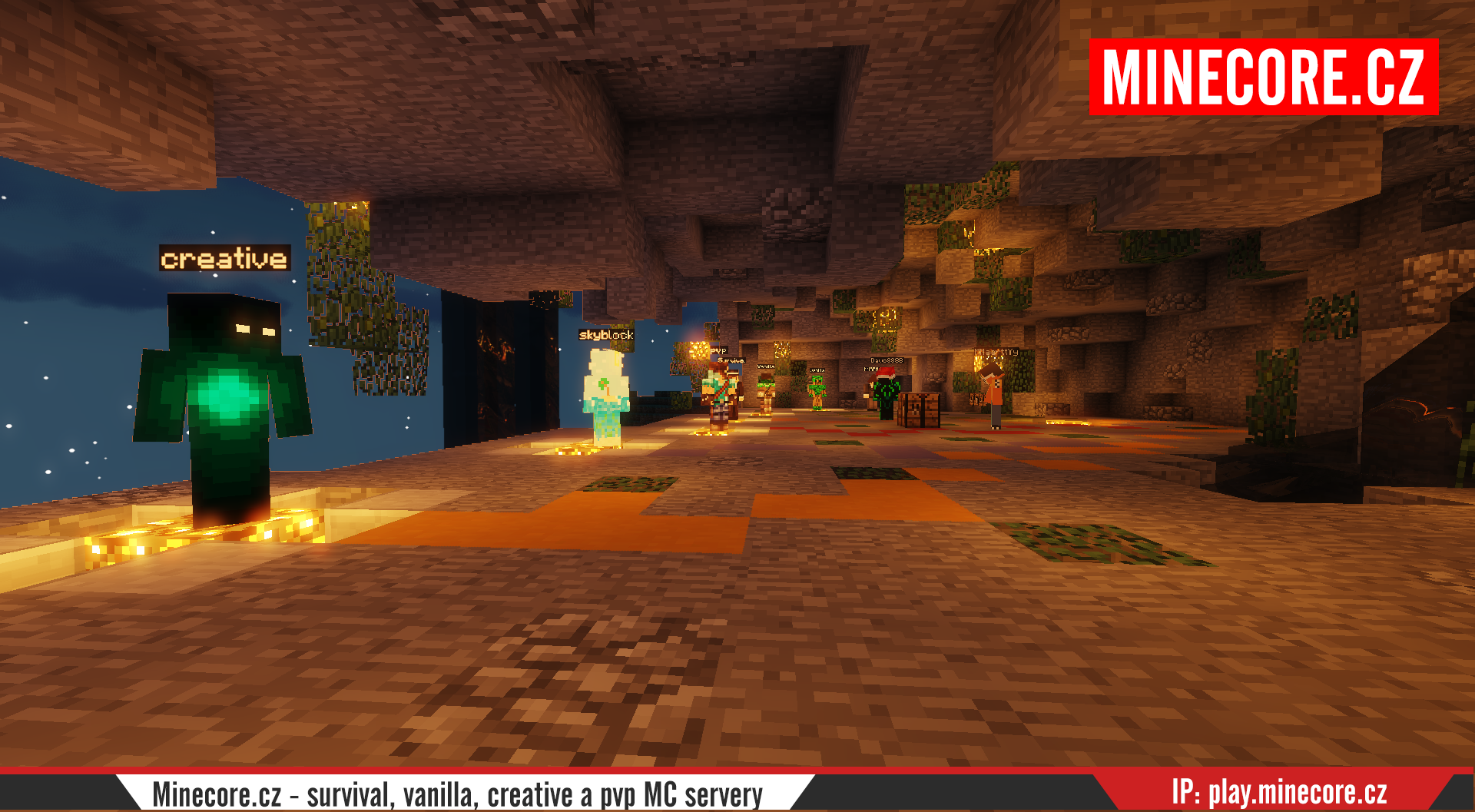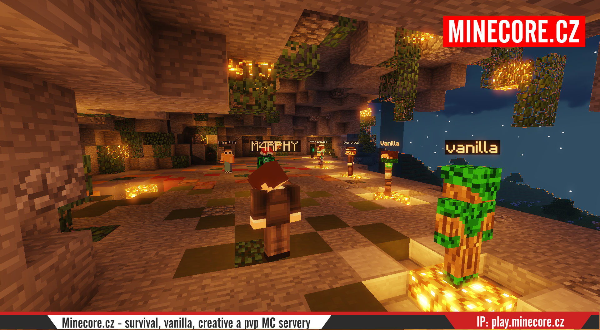 Chce to něco svižného, jednoduchého bez hromady sekcí, NPCček. A tak přišlo na realizaci, která obsahuje pouze několik postaviček k opravdu funkčním serverům, kterým se chceme věnovat. Screenshoty jsou z doby, kdy jsme dělali výstavbu lobby, v současné finální verzi jsou nad jednotlivými NPC hezké texty s popisem konkrétní verze a o čem vlastně server je.